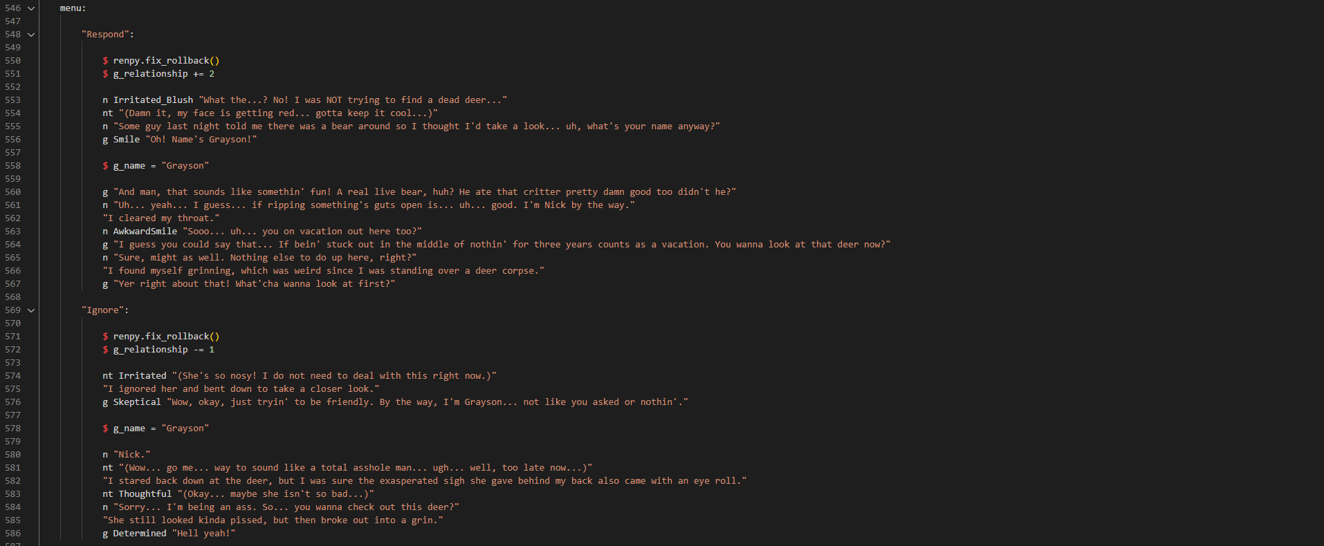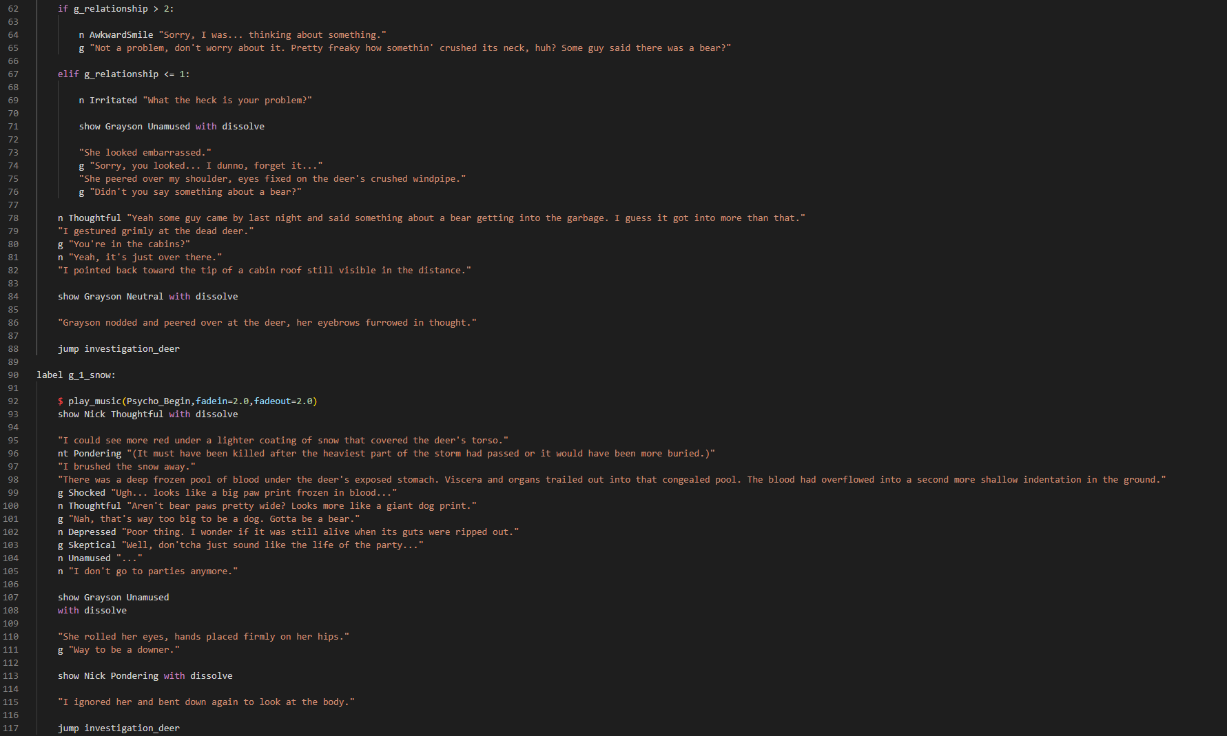 Grayson: "Not a problem, don't worry about it. Pretty freaky how somethin' crushed its neck, huh? Some guy said there was a bear?"